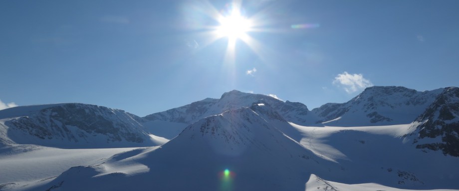 På min vidare färd skidar jag en bit på den omarkerade så kallade jojo-leden. Den kallas ibland även för trepassleden och sträcker sig mellan Tarfala och Unna Räitas. Jag passerar Svarta sjön och ner i Guobirvaggi ligger det 1-2 dm lössnö. Tyvärr är det lite för brant för att jag till fullo ska kunna njuta av den med mina turskidor men det är ju ändå alltid härligt när det yr puder om benen. Nere på platten blir det dock ganska tungskidat men solen skiner och vyerna mot Drakryggen och Kebnekaises toppar är storslagna.