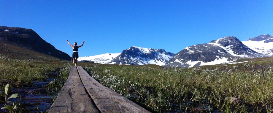 Att löpa på fjället kräver ”härvarande”. Det räcker inte med att man är närvarande i kroppen utan måste också vara fullständigt på plats i tanken. Stigen är varierad, uppför, nerför, sten och spång. Ögonen söker av marken och fötterna dansar fram. Lyft blicken och njut av vyerna, topparna, dalarna och den vidsträckta utsikten. Vissa vi möter hejar glatt, som om vi hade nummerlapp på bröstet och var med i en tävling. Det är kul. Men det sista vi gör är att tävla. Klocka, tid, hastighet och distans är oviktigt. Den egna kroppens rörelse genom landskapet, känslan av att vara ett med omgivningen och inte minst synintrycken från den magiska scen fjällandskapet utgör är det väsentliga.