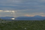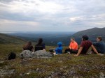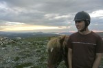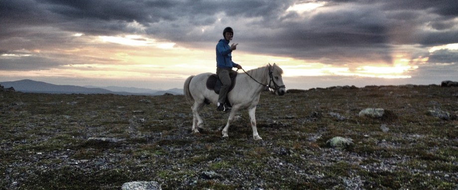 Turen ledde upp på Hovdehögen. En toppur med häst. Islandshästarna är inte stora, men riktiga kraftpaket. Med en imponerande fart letade dem sig upp genom terrängen. Vi stannade till lite då och då så att hästarna skulle få lite svalka och dessutom äta färskt gräs. Vid klockan 20.00 red vi iväg för att undvika den stekande värmen, som ett konstant högtryck som tycks ha parkerat över Jämtland orsakar, under dagarna. Sommarnatten är fantastisk. Solen värmer trots den sena timman och skapar ett magiskt ljus som kastats över landskapet. Tillsammans med molnen färgar den himlen röd. På toppen av Hovdehögen stannade vi till för en fika och hästarna fick vila sig lite inför den fortsatta färden.