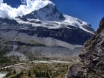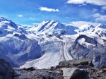 Stigningen upp till Gornergrat flyter på fint hela vägen. Jag passerar några löpare som gått på för hårt i denna tunna luften och får böta med saftig mjölksyra. För min del funkar höjden bra och jag känner inte av någon huvudvärk eller dylikt. Belöningen när jag kommer upp till högsta punkten är ännu vackrare vyer. Jag ser nu in över det mäktiga Monte rosa-massivet som huserar Dufourspitze (4634 möh) som är Schweiz högsta topp. Därtill väller det fram flera stora glaciärer i dalgångarna.