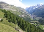 Efter bara någon kilometers löpning viker vi av från asfaltsvägen och in på en stig som sätter av uppför en fjällsida. Det är ordentligt brant och stigen går i serpentiner. Tack och lov så känner jag att flåset är tillbaka men mina vader har visst legat av sig och stramar ordentligt. Efter en timmes löpning så skärper de dock till sig och börjar fungera som de ska igen. Jag springer med två andra och vi håller ett jämnt tempo. När vi kommer upp ovanför trädgränsen blir vyerna fantastiska. Matterhorn ligger som en fond och nedanför vilar Zermatt. Mycket av tiden kollar ja förstås främst var jag sätter fötterna men tack vare att det blir så mycket gång uppför så hinner jag också se mig om och njuta ordentligt.
