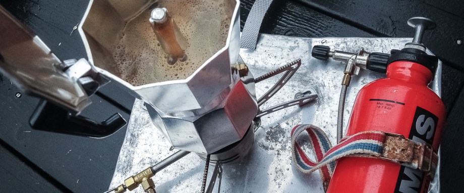 Men när jag nu redan lagt så mycket tid på detta kaffe så vill jag nå hela vägen fram. Jag dyker ner i källaren igen och letar fram trotjänaren från Norge på langs, vårt multibränslekök Omnifuel från Primus. Det kan man lita på. Startar på direkten och efter bara någon minut hör jag det välbekanta puttrandet och kaffedoften sprids över uteplatsen. Utöver kaffe får jag dessutom en liten friluftsupplevlese.