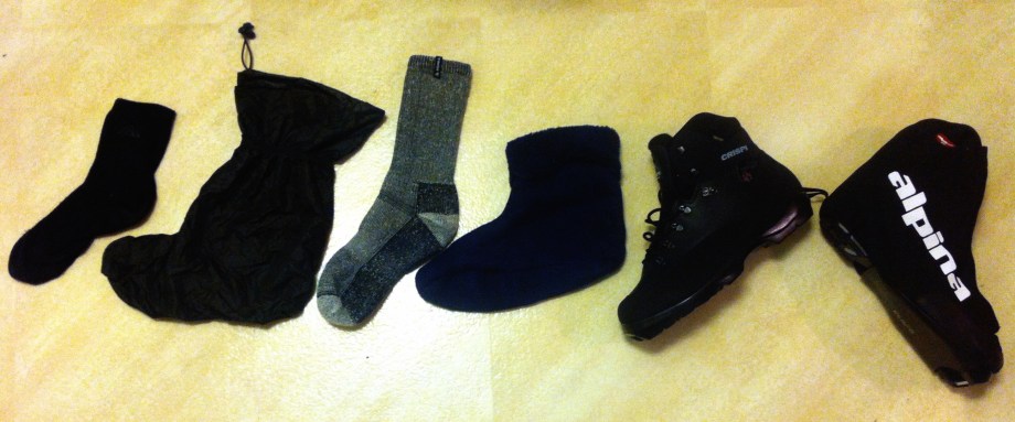 1. Närmast foten en tunn strumpa i ull. Testar en Wool Liner från Aclima. Detta lager ska värma samt ta hand om fukt. När vi slagit läger för kvällen torkas denna strumpa genom att den läggs mot vaden.