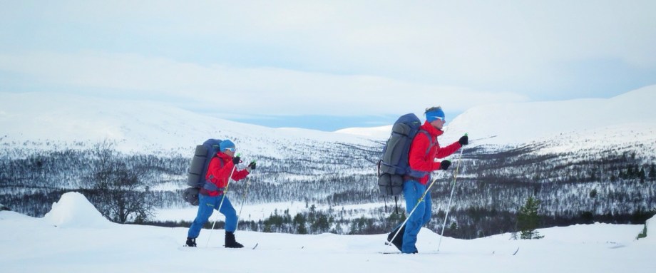 Morgonbestyren tar ett par timmar i lugnan ro och sedan ger vi oss av. Under natten har vi hört att det blåst rejält i trädtopparna. Det var dock helt enligt prognos så vi hade valt en väldigt skyddad plats och det fladdrade knappast något i tältduken. Vi märker dock av vindens framfart när vi börjar skida för det ligger djupa vindpackade snödrivor på flera håll. Dessa gör att vi rör oss väldigt långsamt framåt. Men just denna tur spelar det inte så stor roll är det viktigaste för just nu är att testa utrustning och timmar snarare än mil är det som räknas.