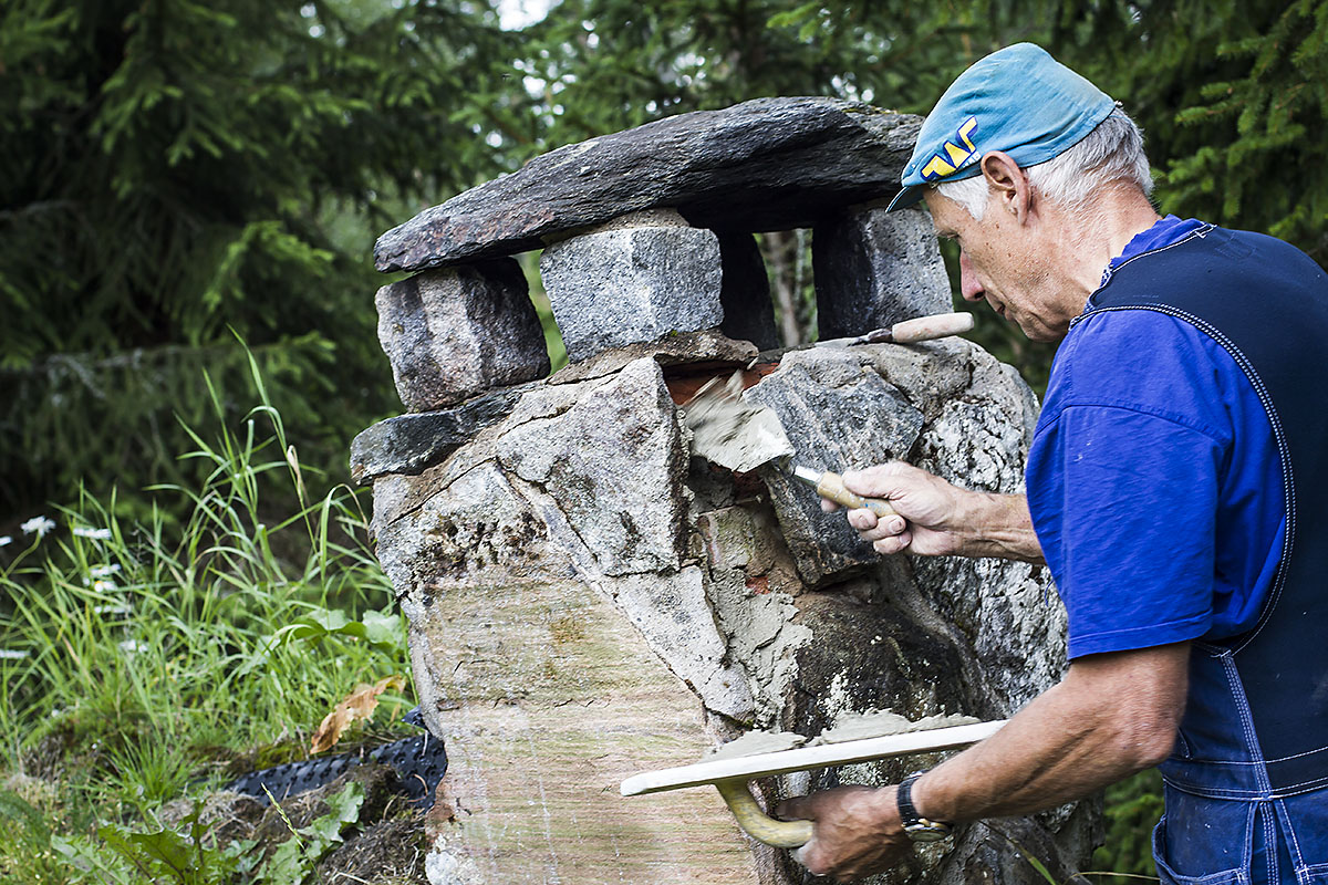 Pappa hjälper mig att renovera den öppna spisen vid kolarkojan. Snickarkepsen sitter på det där speciella sättet som den alltid gjort, lite snett fram åt vänster.