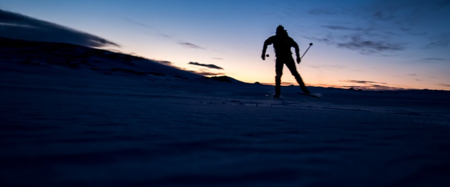 Några kilometer norr om Helags blir föret snabbare igen och jag verkligen njuter av att dansa fram i den blå timmen innan soluppgång. Lagom som jag kommer fram till Fältjägarstugan så träffas jag av dagens första solstrålar. De smeker min kind medan jag äter en muffins.
