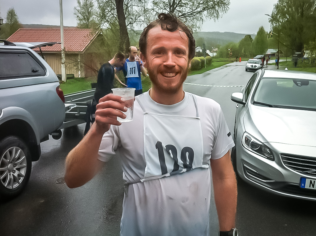 Min kompis Karl följer med till tävlingen och vi rullar iväg ett par mil norrut från Östersund räknat. Det är 8 grader varmt, lätt vind och regnet öser ner. Man brukar säga att det är mer syre i luften under sådan förhållanden men det tvivlar jag. Fast det är verkligen skönt att springa om det inte är för varmt och att det regnar är inget som brukar störa under själva löpningen.
