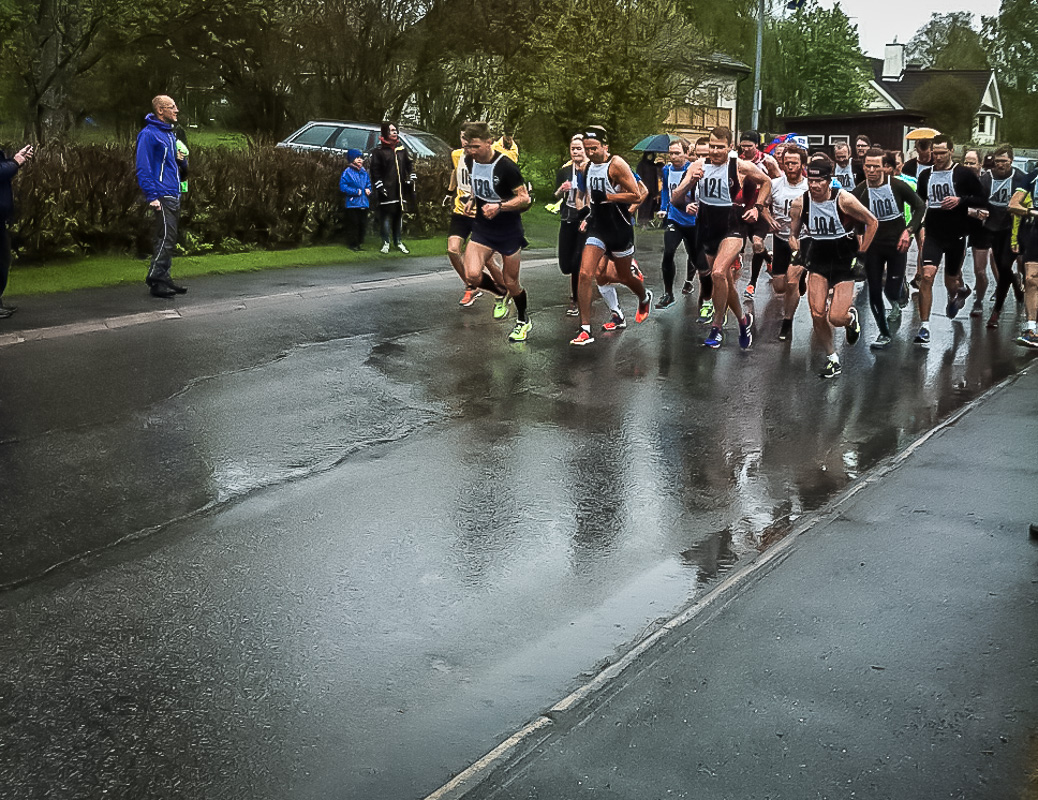 Starten går och jag försöker att inte öppna för hårt utan istället komma in i ett jämnt tempo som jag kan hålla hela vägen. Några riktigt snabba killar bildar snabbt en tätklunga och jag bildar en andraklunga med två andra personer. Första tre kilometrarna hänger jag lätt med och trots att det är en stigning på 50 meter så går de på 11 minuter. Strax efteråt får jag erfara att bristande träning ger ofärdighet. Jag har inte sprungit så mycket ännu i år och orkar inte fortsätta i samma tempo utan tvingas släppa iväg de andra två. Efter sex kilometer blir jag omsprungen, ökar farten något och orkar följa. Är nära att släppa vid några tillfällen men lyckas bita mig fast. Ytterligare en löpare ansluter bakifrån men med 500 meter kvar så höjer jag tempot och lyckas gå ifrån.