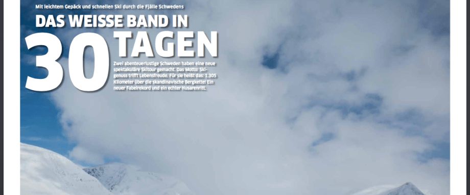Ett av Tysklands ledande magasin för skidåkning och outdoor, Nordic Sports nr6 1015, har publicerat en artikel om turen Vita Bandet 30 dagar. Skidturen Niclas och David gjorde genom den svenska fjällkedjan vintern 2014. Med start i Grövelsjön i söder och slut vid Treriksröset. 130 mil på 29 dagar.