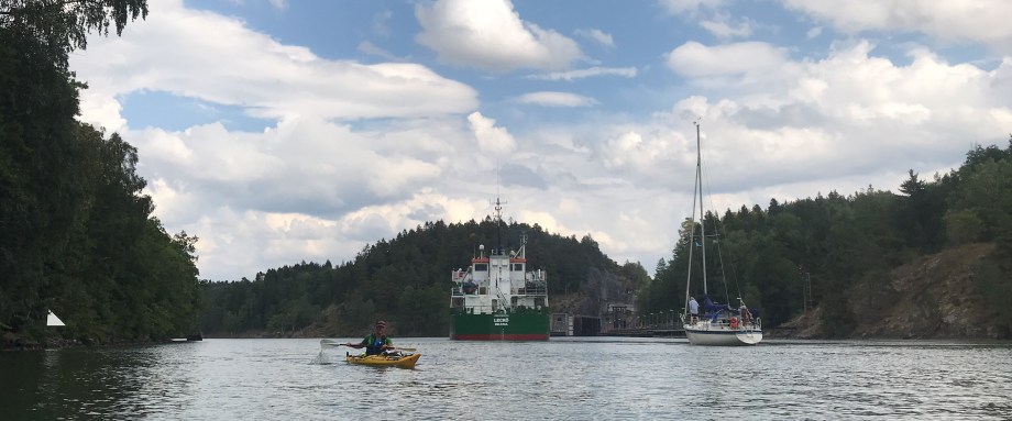 Efter lunchen lastade vi kajakerna på vagnar och rullade genom slussområdet. Ett fantastisk ställe där de gamla slussvägarna från 1800 och 1844 finns bevarade. Den som används idag invigdes 1916. Janne som är hemma i området och dessutom historielärare i grunden gav oss en guidad tur. Området är trevligt och har mycket att erbjuda, även till dig som inte åker båt.