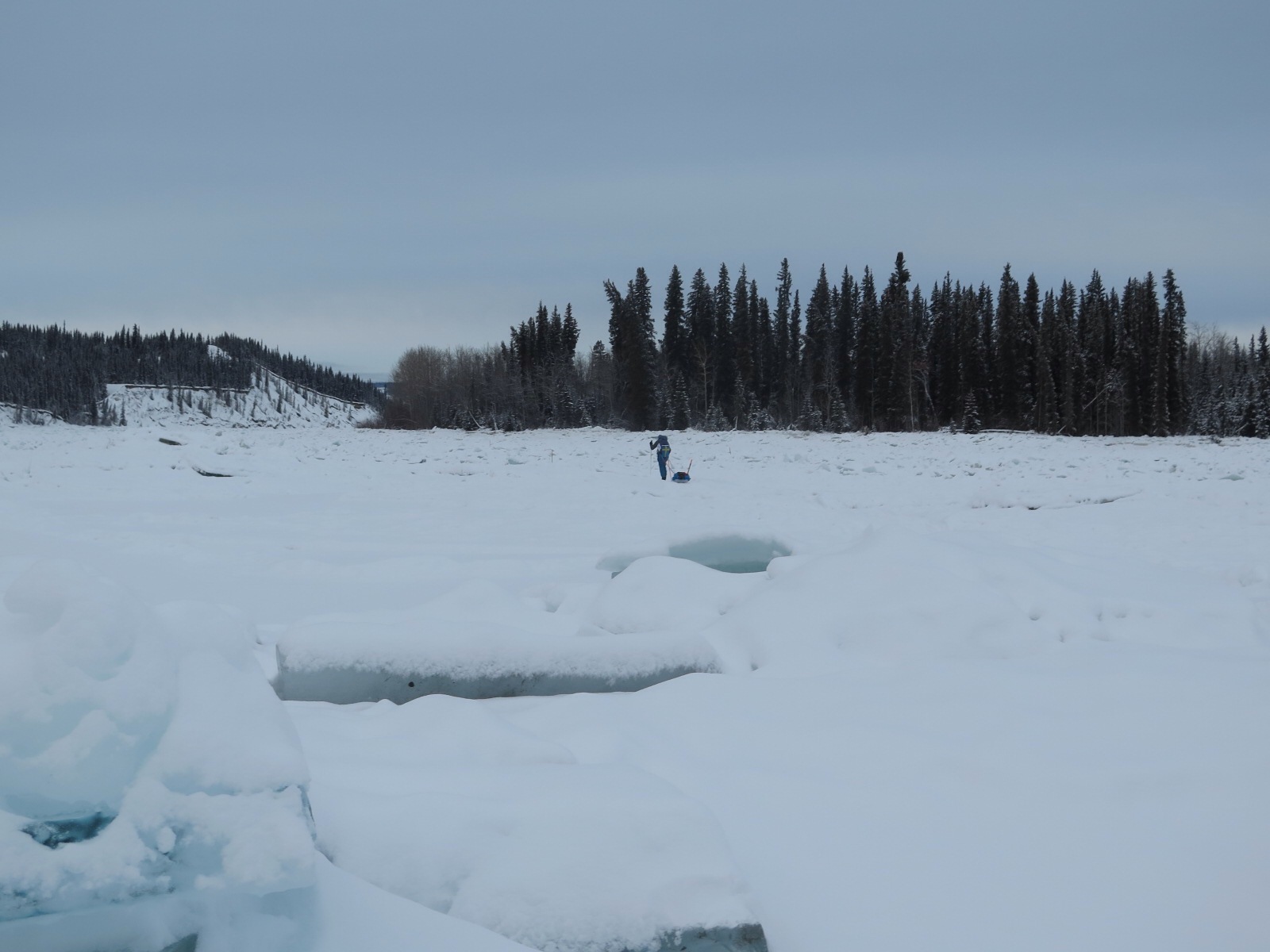 Från Scroggie Creek fortsätter färden vidare på floden. Mark följer oss ner till floden och tar med sin quadrocopter. Han skickar upp den i luften och filmar oss medan vi skidar iväg. Vi hoppas få tillgång till det klippet vad det lider. Lite svårt att få till den vinkeln på egen hand. Färden på floden är vacker och området här norr om Pelly Farm mot Dawson City känns betydligt mer vilt än tidigare. Bergen runt oss är högre.