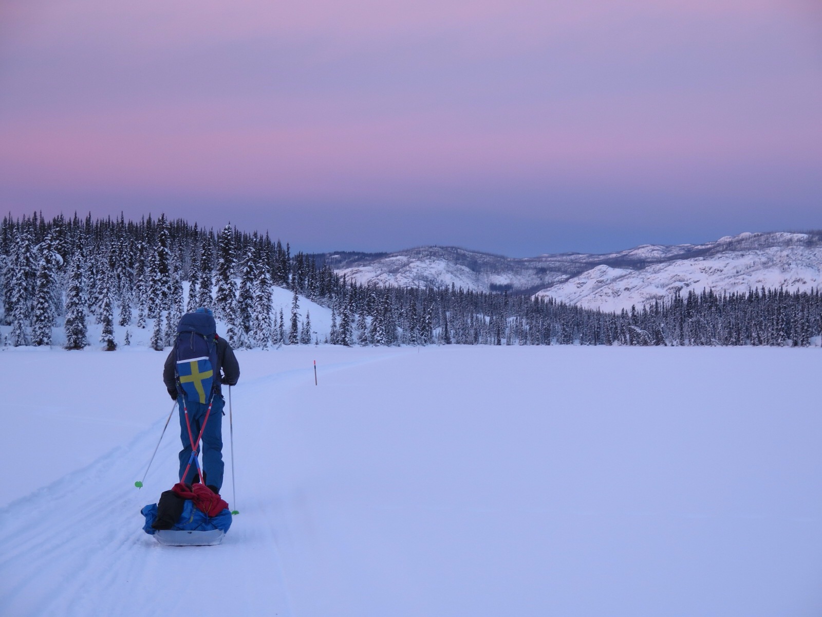 Idag är ingen vanlig dag utan Niclas fyller 30 år så det känns extra bra att det blir en så trevlig frukost. Vi tänder våra pannlampor och lämnar civilisationen bakom oss. Nästa gång vi ska återse bebodda platser är i Dawson City 26 mil längre fram. Det är fridfull morgonskidåkning som står på schemat och vi verkligen njuter. Vi har bestämt att vi ska skida till klockan 18 och att vi inte ska trycka på utan skida fram i sakta mak och njuta av dagen. Vi har ju nu förskjutit vår dygnsrytm endel vilket innebär att vi äter lunch vid niotiden när solen går upp. För att bli så effektiva som möjligt stannar vi först ett par minuter och fyller hetvatten i våra påsar med frystorkad mat från Outmeals. Sedan skidar vi typ ytterligare en kvart och så kan vi sätta oss direkt vid ”dukat bord”. Det är helt enkelt så att vi inte kommer framåt när vi står stilla och därför försöker vi att vara så effektiva som möjligt när vi fixar med saker om det inte råkar vara så att det är just vilan som vi vill åt.