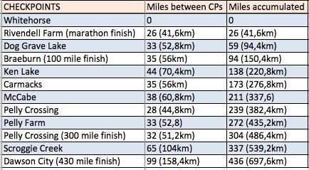 För sträckan 430 miles (70 mil) är ändhållplatsen Dawson City. Utmed vägen måste 10 checkpoints passeras där man som deltagare kontrolleras och alla som bedöms vara i dugligt skick får fortsätta vidare.