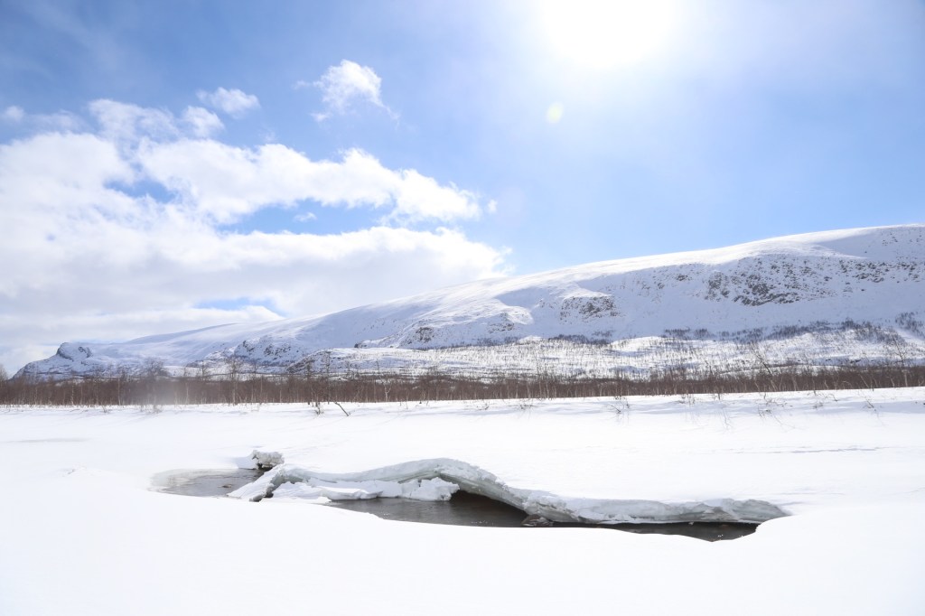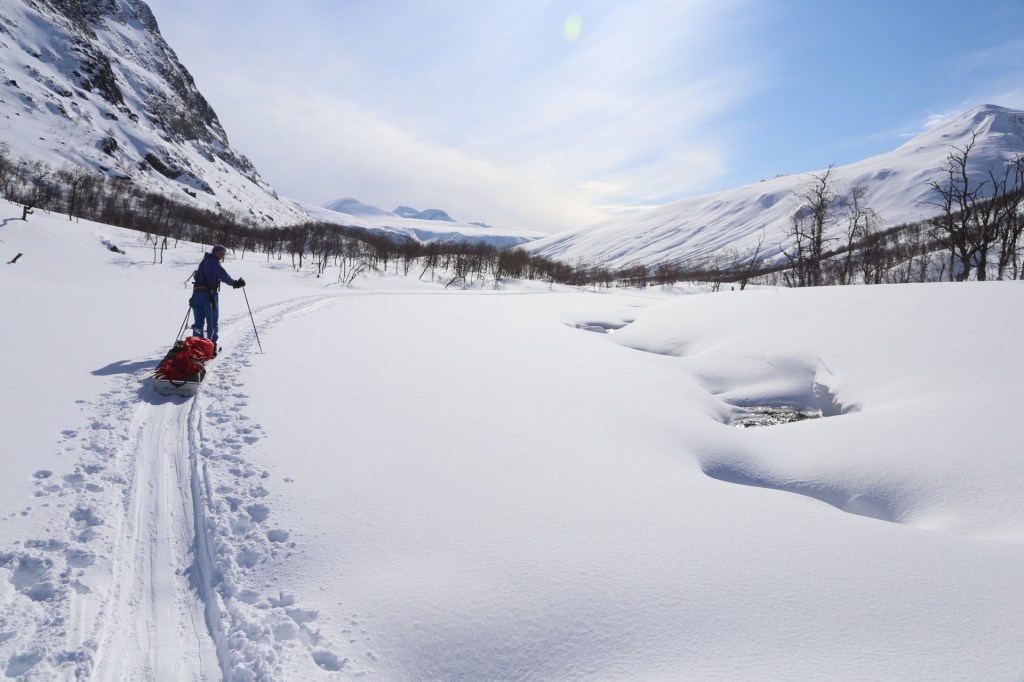 Efter sedvanliga morgonbestyr fortsatte vi färden västerut genom den imponerande Rapadalen med vinden i ryggen och lätta snöflingor i luften. Ibland är vattendraget brett och formar små deltan men ibland kläms dalgången ihop av mäktiga berg på båda sidorna och Ráhpaädno antar då formen av en kanjon med branta sidor. På många ställen har vattnet ätit sig igenom både is- och snölager vilket betyder att vi kan hitta öppet vatten. Det är bra. Mindre bra är att vi ibland måste upp på land och skida. Det kan då bli spännande vägar som är branta både upp och ner genom fjällbjörkskogen.