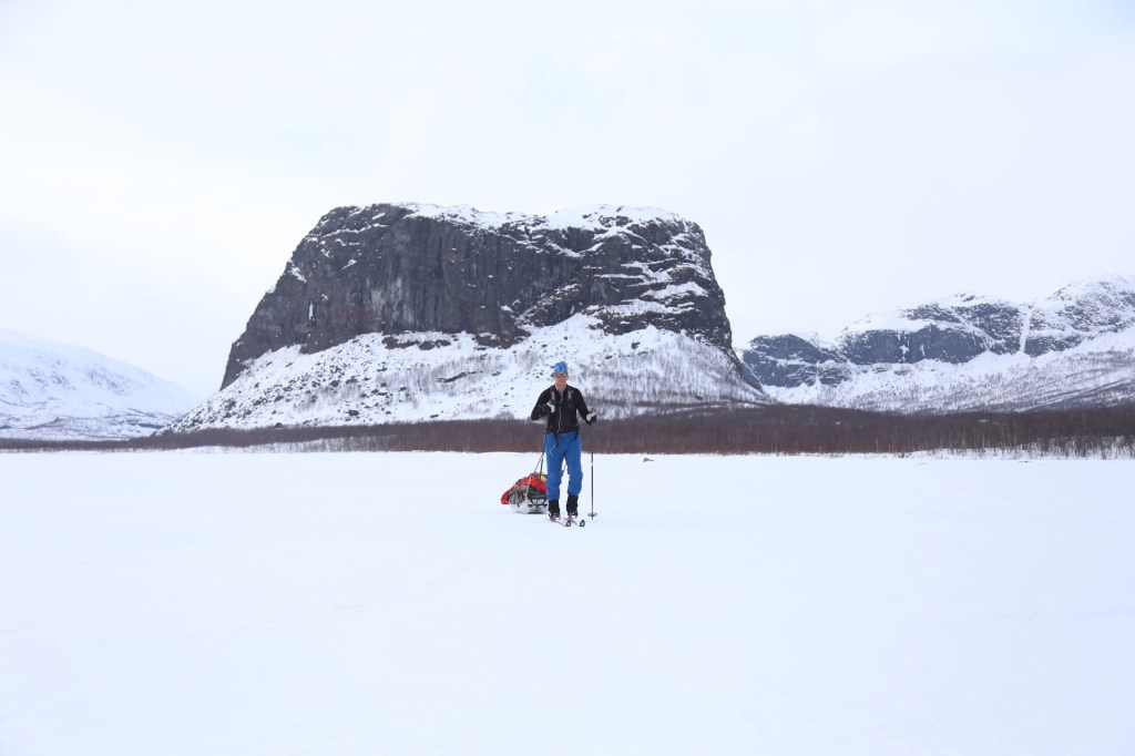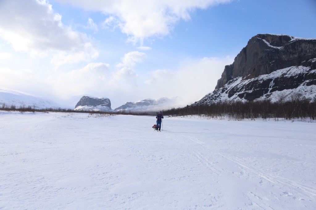 Lite sidvind och lätt snöfall över sjön Langas till Saltoluokta fjällstation. Där lade vi på de långa stighudarna och tog oss upp på kalfjället. Ganska omgående kom jag in i det meditiva lunkandet som det innebär att bogsera en pulka uppför ett fjäll. Ena foten framför den andra i en lugn och jämn takt. Snön flyger fram över vidderna och tanken får flyga fritt i huvudet.