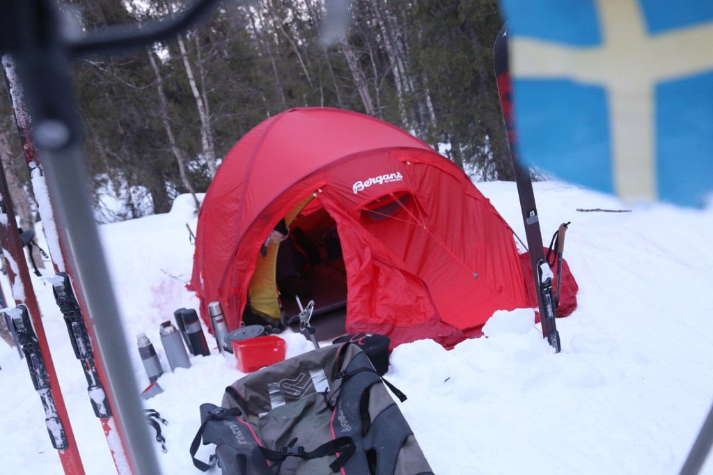 Natten skulle enligt prognos kunna bli blåsig och snöig. Vi hade hittat ett fint vindskyddat läge att slå läger på och förankrat tältet rejält med både skidor och stavar. Vi kunde höra vinden vina men vårt tält, Bergans Expedition Dome, rörde sig knappt. Vi sov gott men vaknade på morgonen av att det letade sig in lite snö genom den öppna ventilationen som förvandlades till vatten så snart flingan träffade ansiktet.