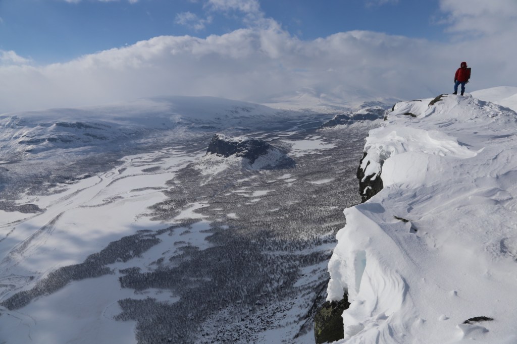 Idag har vi tänkt oss att bestiga Skierffe så lagom som vi har gjort det mesta av stigningen viker vi en bit från leden och lämnar våra pulkor. Vi packar ned det nödvändigaste i varsin ryggsäck och tågar iväg mot toppen. En avstickare på totalt 14 km. Det är mestadels en ganska snäll lutning och väldigt skönt att för en stund skida utan pulkan på släp.