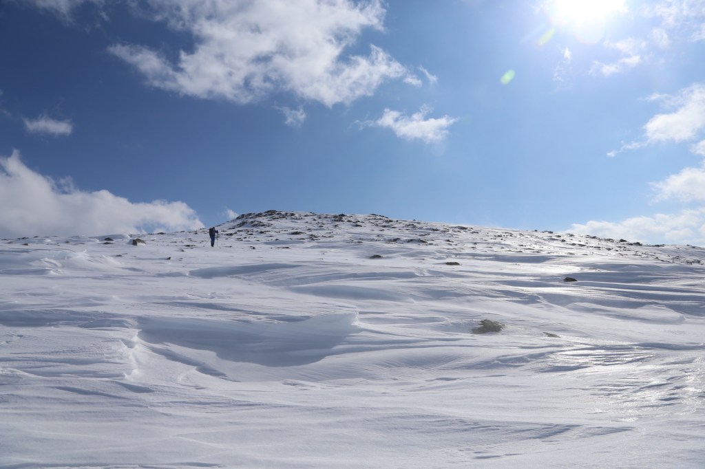 Vägen ner går smidigt med vinden i ryggen. Endast lite hårt den första biten där vi går till fots ner till skidorna.
