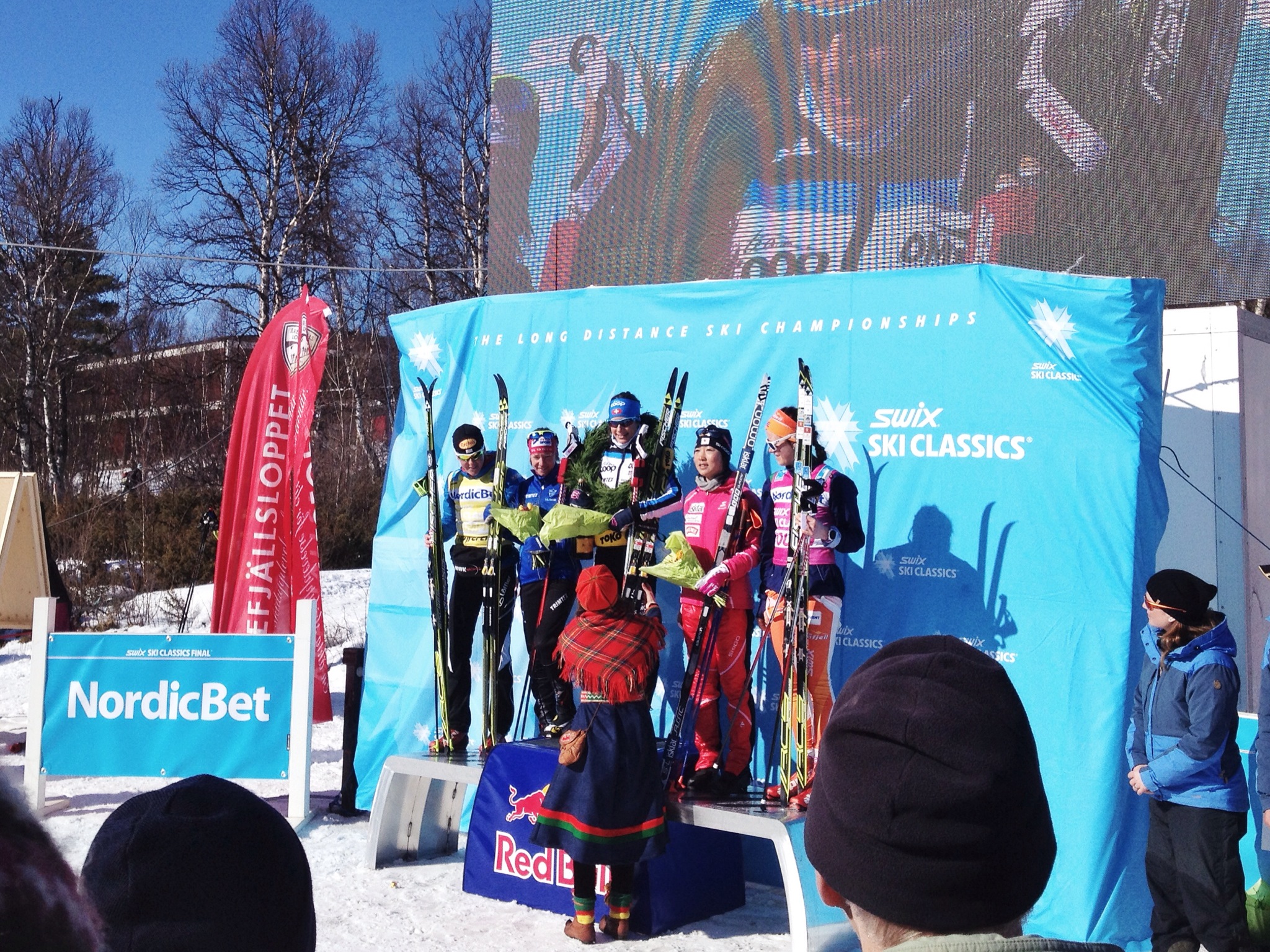 Vädret är helt enastående under loppet. Det har snöat någon decimeter dagen innan och solen skiner nu från en klarblå himmel. På det andra varvet sträcker sig banan upp mot kalfjället via en riktigt lång stigning i vilken jag plockar en massa placeringar. Vi åker bland annat i det så kallade Sapporospåret och jag njuter av varenda backe och en massa mäktiga vyer. Ner från fjället är det en riktigt lång och snabb utförslöpa i vilken klockan visar 59,5 km/h