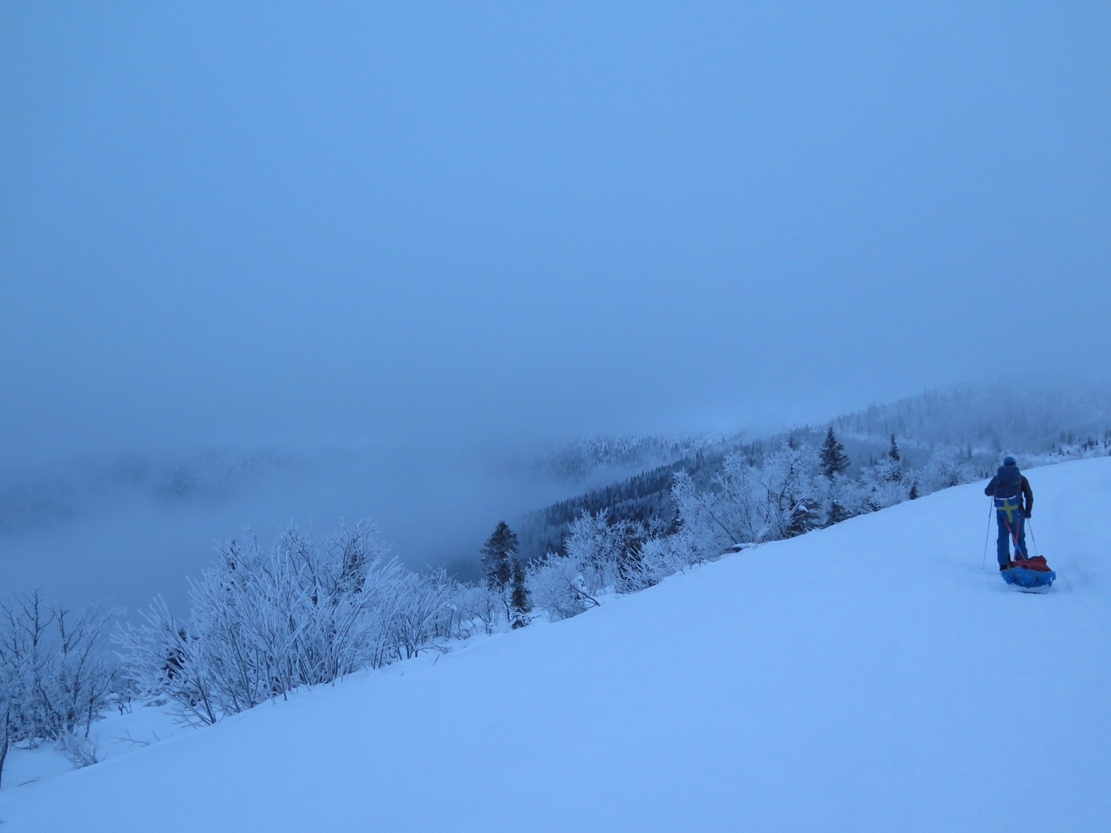 Början går bra. Men efter 45 minuter gör sig nattens sömnbrist påmind. Ögonlocken förvandlas till betong och gravitationen är oregerlig. Jag försöker med taktiken att blunda med ett öga i taget. Det resulterar i många snedsteg. Men jag tar mig framåt. Från skyn faller lätta flingor. Bra skidföre.