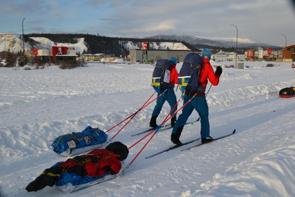 Kliver ur hissen i lobbyn på hotellet Coast High Country Inn med pulka och skidor på släp. Det är inte bara vi som ska packa det sista. Hela rummet svämmar över med utrustning, cyklar, pulkor och människor. Ute är det -30 så där vill inte vi, och ingen annan heller, stå och fixa. Men inne är det så varmt att det blir till att slita av sig alla kläder för att inte svetta ner sig redan innan start. Färdigheterna att snabbt kunna reglera klädsel får vi användning för direkt.